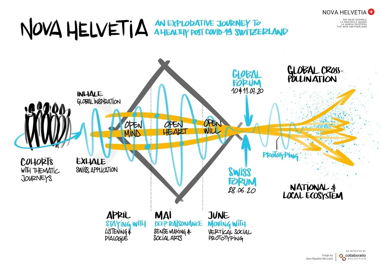Bern, 23. Juni 2020. Als Antwort auf die Corona-Krise hat die Organisation collaboratio helvetica die Initiative «Nova Helvetia» für eine regenerative und gesunde Post-Corona-Schweiz lanciert. Während drei Monaten haben interessierte Personen aus der ganzen Schweiz gemeinsame Reflexionen und Visionen zu Themen wie Bildung, Geschlechtergerechtigkeit, die Zukunft der Demokratie oder nachhaltige Städte erarbeitet. Am Swiss Forum vom 28. Juni 2020 werden die Resultate dieser Arbeitsgruppen präsentiert. Mehr