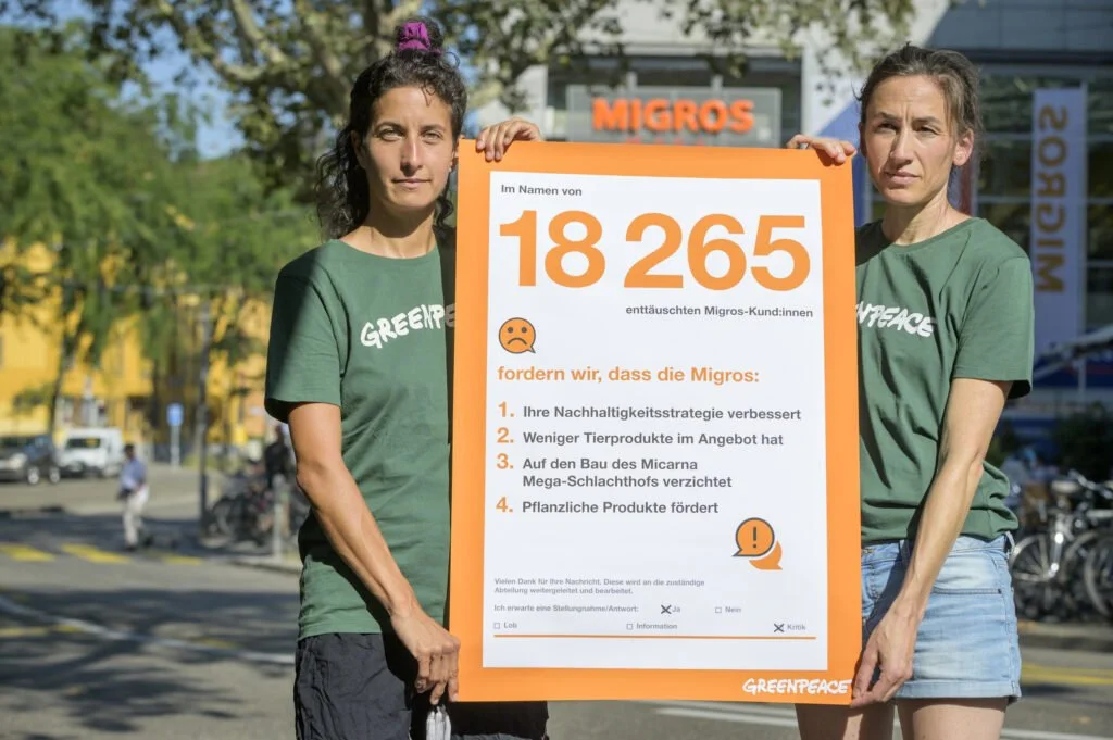 Catalyst Alexandra Gavilano, Project Lead für Sustainable Foodsystems bei Greenpeace, überreichte der Migros am Dienstag, 22. August, einen Appell für mehr Klimaschutz und Biodiversität. Rund 18’265 Personen fordern darin mit ihrer Unterschrift «weniger Fleisch – mehr pflanzliche Produkte».
